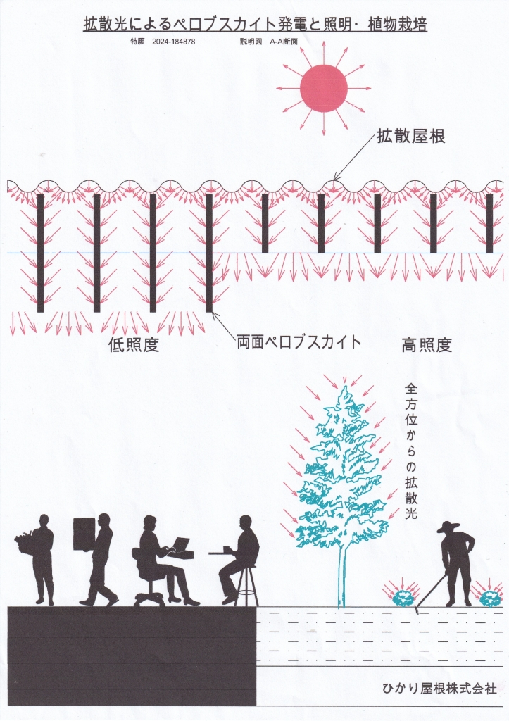 弊社の開発が3つのペロブスカイト関連特許になります。太陽の拡散光を活用する弊社技術と ペロブスカイト太陽光パネルが農地の上やその他の活動場所の屋根部を発電所に変えます。農作物の作柄を改善し、発電パネル温度上昇も抑制しクリーン電力の発電量も増加させる画期的な技術でSDGsを促進します。